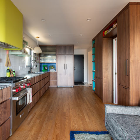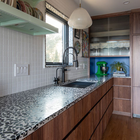 Stepping into the heart of the home, the newly completed kitchen remodel evokes a sense of nostalgic sophistication, whisking one away to the iconic era of mid-century design. Drawing the eye is the terrazzo countertop, its confetti-like patterns and earthy tones offering both visual interest and timeless grace. The surrounding reeded, stained cabinets instill warmth and texture, setting the stage for a culinary theater bestrewn with vibrant splashes of color. Commanding attention, the pristine yellow hood bestows a cheerful aura, juxtaposing the subtle hues and infusing the space with an invigorating energy. Not to be overlooked, the striking cabinet enclosing the doorway stands as a testimony to the power of color, framing the entrance with bold authenticity and ensuring the remodel leaves an indelible, vibrant impression on anyone who enters.