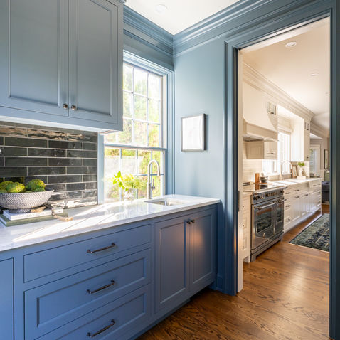 The main level was reorganized to feel composed and intentionally finished. The kitchen was expanded and paired with a new butler’s pantry, with custom cabinetry acting as both storage and architectural finish. A light-filled sunroom addition now serves as a dedicated place to paint in natural daylight, and the dining room gained both a concealed bar and a coffered feature ceiling that brings beauty and utility into balance. The primary suite was fully updated to create a private sanctuary for the homeowners, separate from the activity of the main floor.